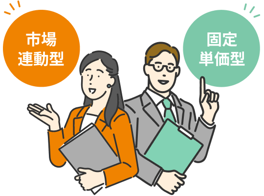 電気料金の安定性を重視する法人様には「固定単価型」プラン、多少のリスクはあっても安さのメリットを重視される法人様には「市場連動型」プランのどちらもをご提案が可能です。どちらが適しているかわからない場合も、お気軽にご相談ください。